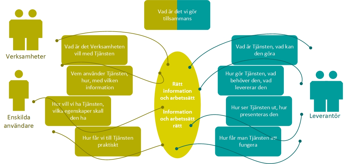 Vad är det vi gör tillsammans? Detta handlar om syfte och mål med tjänsten och vad verksamheten vill ha ut av den. Detta kan ofta hämtas från ett projektdirektiv eller annat måldokument och exempelvis vara att verksamheten behöver en molntjänst för att lagra arbetsdokument och där tjänsten erbjuder ett smidigt sätt att jobba, säkerhet i form av tillgänglighet, backup och problemfri drift. Om vi antar att scenariot att ta hem sin information handlar om en molntjänst för dokumentlagring, behöver man börja redan här och beskriva syftet med att informationen skall tas hem. Det kan vara förändrad driftsform eller en lokal backup. Utifrån det kan man börja förstå vad det innebär att ta hem informationen.