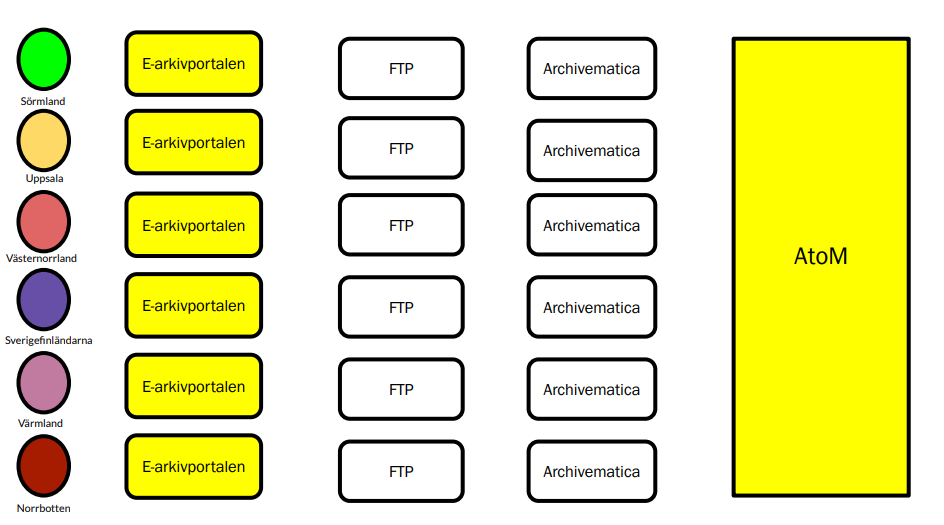 Vår e-arkivlösning bygger på OAIS-modellen och består av tre delar. Dessa är e-arkivportalen, Archivematica och AtoM. Filerna som ska e-arkiveras lämnas in och metadatasätts via e-arkivportalen, bevaras långsiktigt i Archivematica och tillgängliggörs i AtoM, (Access to Memory). Den publika delen kallar vi forskarsalen.